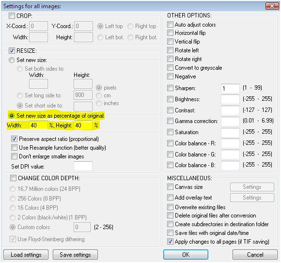 Dopo aver cliccato su Ok, apriamo le Advanced Options, nella quale è possibile andare ad agire sulla parte grafica delle immagini. Personalmente, l'unica modifica che ho fatto è quella relativa alla riduzione delle dimensioni, andando ad ottenere immagini ridotte del 40% rispetto alle originali ed ottenendo, così, una diminuzione da 3.5Mb a 150Kb: