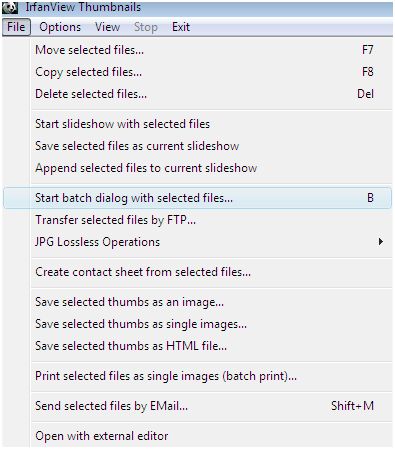 Nella parte destra del software avremo le anteprime delle nostre immagini: selezionamo quelle che vogliamo ridimensionare (mantenendo premuto CTRL e premendo A). Una volta completato questo step, avviamo il batch configuration dialog dal menu File -> Start batch dialog with selected files…:
