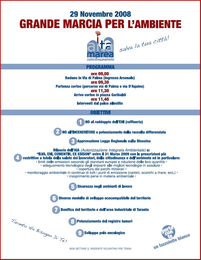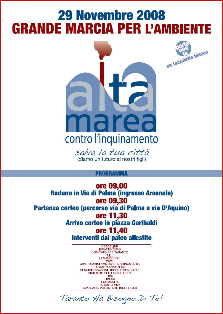 Se hai a cuore la salute dei tuoi cari , se hai a cuore le sorti della tua afflitta e bellissima città non puoi mancare alla grande manifestazione del 29 novembre, organizzata da "Alta Marea", che racchiude la gran parte delle associazioni che in questi anni hanno combattuto per cercare di ridare un colore pulito al cielo di Taranto. Siamo tutti riuniti sotto un’unica bandiera: liberare noi e i nostri figli dai veleni dell’inquinamento.
