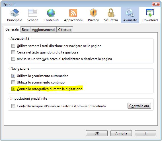 - Dizionario italiano – Permette di aggiungere il dizionario italiano per il controllo ortografico (è installato di default installando Firefox localizzato in italiano). Lo si abilita da Strumenti -> Opzioni -> Avanzate: