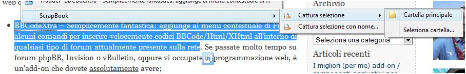 - ScrapBook – Mi capita spesso di trovare, in giro per il web, qualche informazione che so che potrà ritornarmi utile in futuro, e quando poi ne ho bisogno non so più dove andarla a ritrovare (per quanto – direte voi – può essere semplice inserire la pagina tra i preferiti). Scrapbook si attiva – una volta installato, con la combinazione di tasti ALT + K, ed appare con una barra laterale. Per salvare singole parti di una pagina Internet basta selezionare con il mouse tutto il contenuto che ci interessa, cliccare con il tasto destro e selezionare Scrapbook -> Cattura Selezione -> Cartella Principale (nel caso potrete personalizzare anche le cartelle come se fossero dei veri e propri segnalibri) e nella finestra di Scrapbook, in cui possiamo organizzare tutti i nostri appunti in cartelle e in sottocartelle. Come ripristinarli? Con un semplicissimo doppio click del mouse!