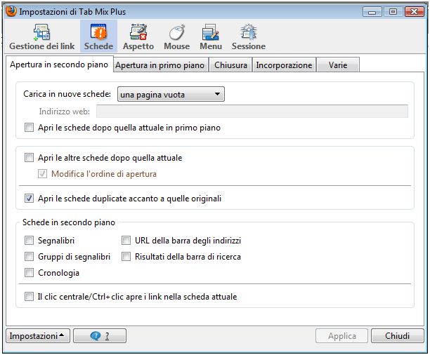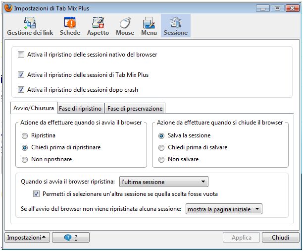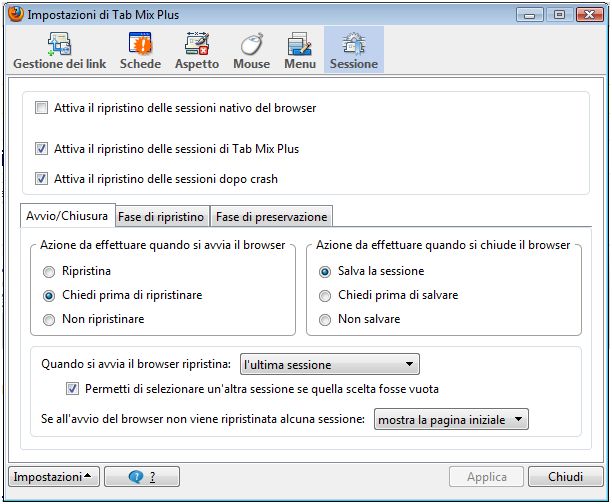 - Tab Mix Plus – Moltiplica le opzioni di configurazione per le schede di Firefox. Una volta installata, sarà possibile – ad esempio – duplicare schede, controllarne l'apertura in primo piano, annullare la chiusura di una scheda o finestra, controllare e salvare le sessioni di navigazione, e tanto altro 🙂