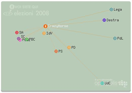 In ogni caso, su Ubuntista ho trovato il link a OpenPolis, su cui è possibile effettuare un test in 25 domande il cui risultato dovrebbe visualizzarvi la vostra vicinanza/distanza a questo o quello schieramento politico. Ecco il mio risultato: