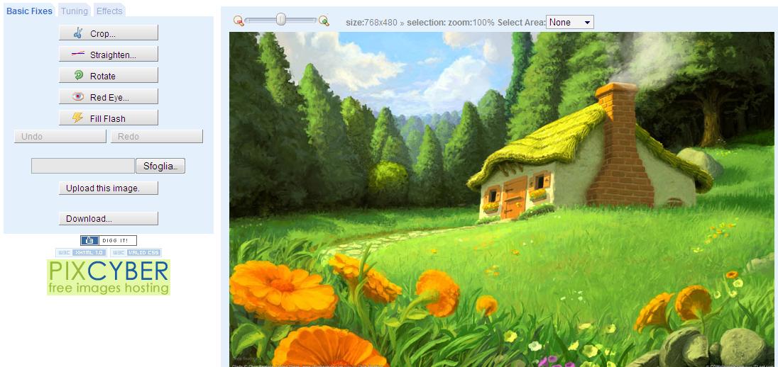Ottimo tool gratuito, da la possibilità di caricare le proprie immagini (Upload this image), modificarla con uno qualsiasi tra i filtri o le funzionalità a disposizione, come ad esempio la rimozione degli occhi rossi o aumentare/diminuire la luminosità dell’immagine, e alla fine scaricarla (Download). Lo trovate qui