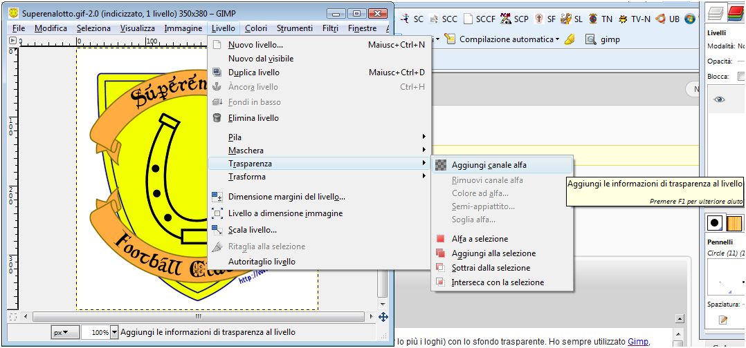 - Apriamo l'immagine che dobbiamo rendere trasparente, ed aggiungiamo un canale alfa (Livello -> Trasparenza -> Aggiungi canale alfa):