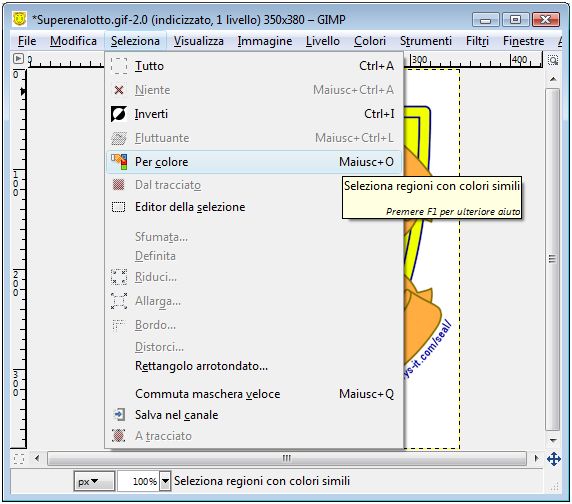 - Selezioniamo il colore che vogliamo rimuovere dall'immagine per renderla trasparente (Seleziona -> Per Colore -> Click sul colore da rimuovere):