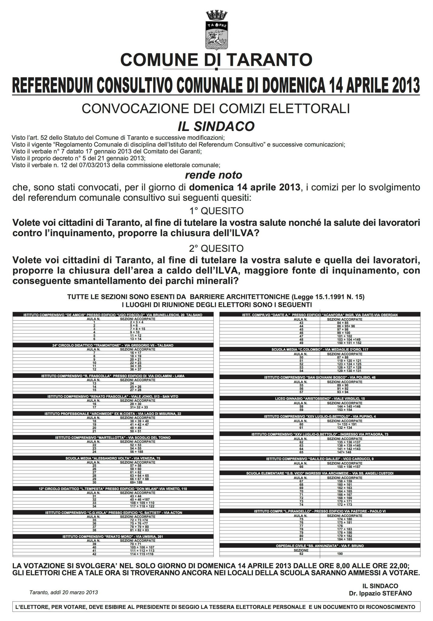 1. Volete voi cittadini di Taranto, al fine di tutelare la vostra salute nonché la salute dei lavoratori contro l'inquinamento, proporre la chiusura dell'Ilva?