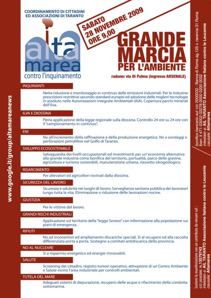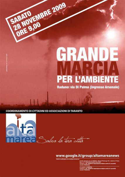Intanto, come giustamente ha scritto qualcuno, si scopre che la già citata modifica al regolamento comunale non è valida, in quanto non era stato raggiunto il numero legale per deliberare, e questa si va a sommare alle tante figuracce collezionate dai politici locali (di destra e sinistra che siano, sia chiaro!). Lo stesso Consiglio Comunale si è aggiornato a Venerdì 20 Novembre, dalle 9.00 alle 12.00 per ri-deliberare…e gli attivisti di Taranto si sono già organizzati per essere presenti, mentre alle 10.00 dello stesso giorno, presso il Salone degli specchi a Palazzo di Città, AltaMarea terrà la conferenza stampa di presentazione della Manifestazione ormai prossima. E, per fortuna, si scopre anche che esistono ancora gli operai di una volta, quelli che hanno scritto al Comitato per Taranto dissociandosi dai colleghi autori della missiva del 7 Novembre e schierandosi dalla parte di chi lotta contro l'inquinamento con un solo obiettivo: liberare Taranto da questa morsa che la rende la città più inquinata e dissestata d’Italia e forse d’Europa (cit.).