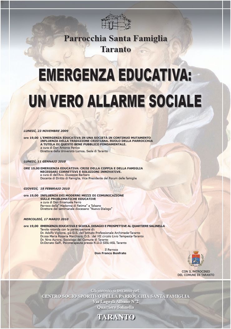 Segnalo a tutti la serie di convegni dal titolo "Emergenza Educativa – Un vero allarme sociale", organizzati dalla Parrocchia Santa Famiglia con il Patrocinio del Comune di Taranto, in programma nei giorni 23 Novembre 2009, 11 Gennaio, 18 Febbraio e 17 Marzo 2010.