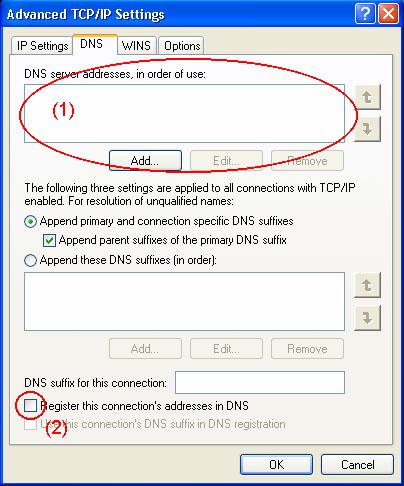 • Clicking in all network card properties (wired and wireless), "General" tab -> TCP/IP -> Properties -> Advanced -> DNS tab (see following image):